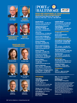 Material in this magazine may be reproduced in whole or part with a credit line reading “Reprinted from The Helen Delich Bentley Port of Baltimore Magazine.” The Maryland Department of Transportation Maryland Port Administration is an equal opportunity affirmative action agency.