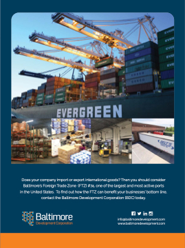Does your company import or export international goods? Then you should consider Baltimore’s Foreign Trade Zone (FTZ) #74, one of the largest and most active ports contact the Baltimore Development Corporation (BDC) today.